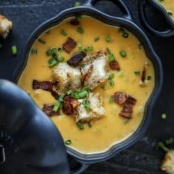 Smoky Pumpkin Bisque with Grilled Cheese Croutons.