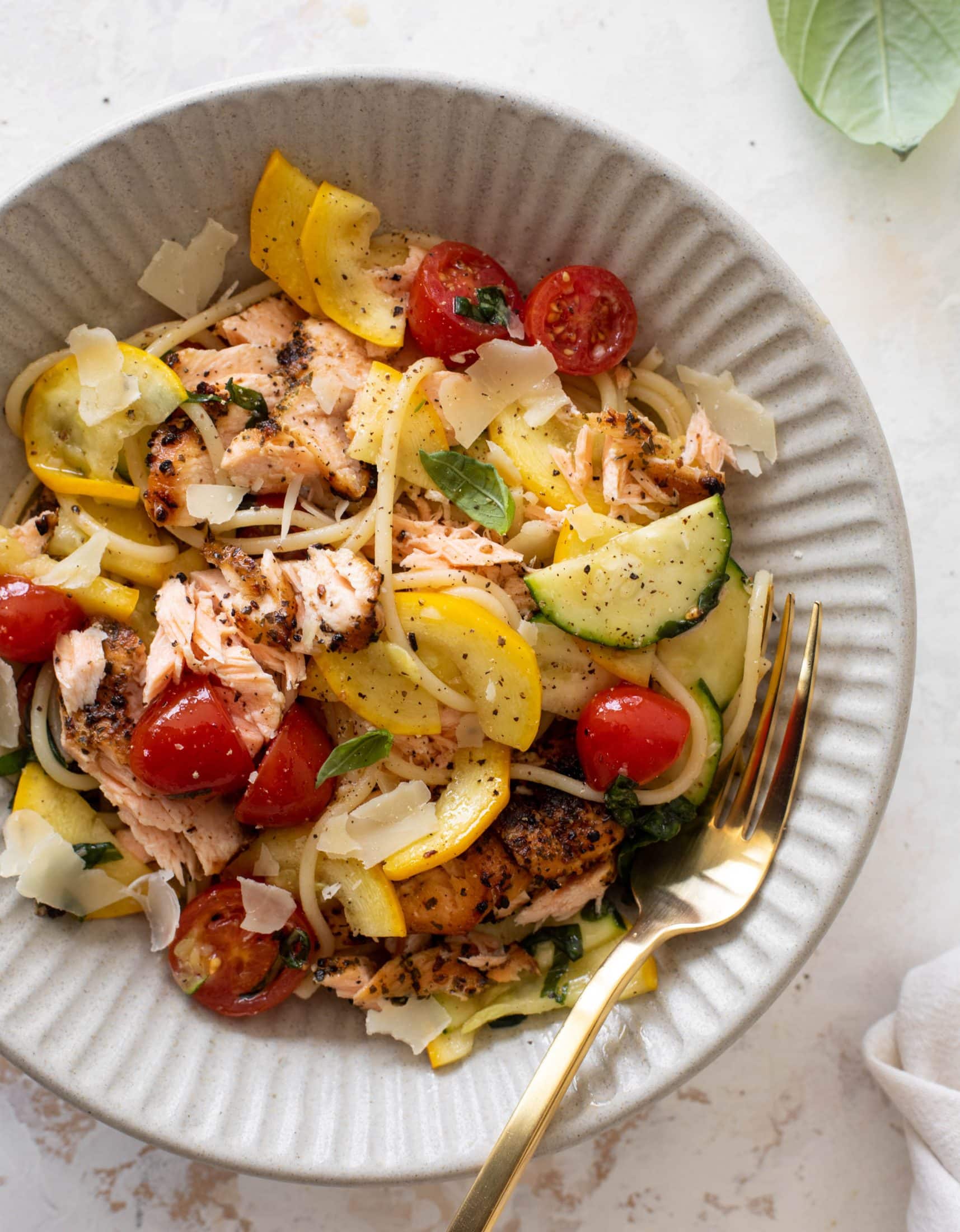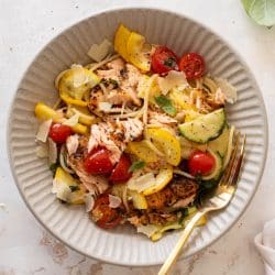 This summer salmon spaghetti is so fresh, satisfying and delicious. It’s a big bowl of garden vegetables tossed with grilled salmon and hot pasta. The flavor is incredible, it’s light enough to enjoy on a hot day and it’s very customizable if you have other veggies on hand.