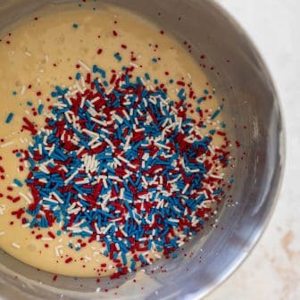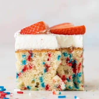 Funfetti flag cake is festive and delicious! White sheet cake filled with patriotic sprinkles and topped with fresh whipped cream, blueberries and strawberries. It’s...
