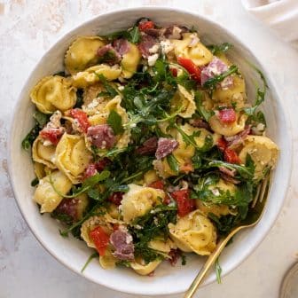 This is the best tortellini salad ever! Loaded with baby arugula greens, roasted red peppers, salami, feta cheese and more, it is so satisfying...