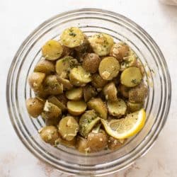 If you love an easy side dish that’s almost potato salad, but not traditional potato salad, I hear you! This lemony, herby potato salad has a delish vinaigrette, tender potatoes, shaved parmesan, fresh chives and garlic. It tastes amazing and is a great weeknight side dish.