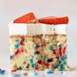 Funfetti flag cake is festive and delicious! White sheet cake filled with patriotic sprinkles and topped with fresh whipped cream, blueberries and strawberries. It’s fun to make and great for a party!