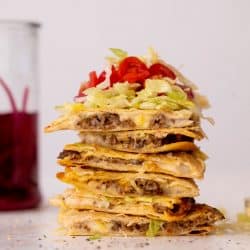 These crispy baked cheeseburger quesadillas are a huge favorite in our house. Crispy flour tortillas filled with cheddar cheeseburger beef, topped with lettuce, tomato, pickles onions and the best burger sauce ever.