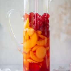 And, um, my favorite part? The frozen peaches used as ice cubes, of course! This is my favorite summer hack. Get a bag of frozen peaches and use them as ice in your drinks. In this case, we’re using an entire bag. The peach slices not only chill the drink, but also infuse a good amount of peach flavor into the pitcher.
