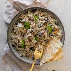 This cherry jalapeno chicken salad is packed with flavor! It’s the perfect blend of savory with a hint of tart sweetness and a little spice. Make it ahead of time to serve on sandwiches, with crackers and more!